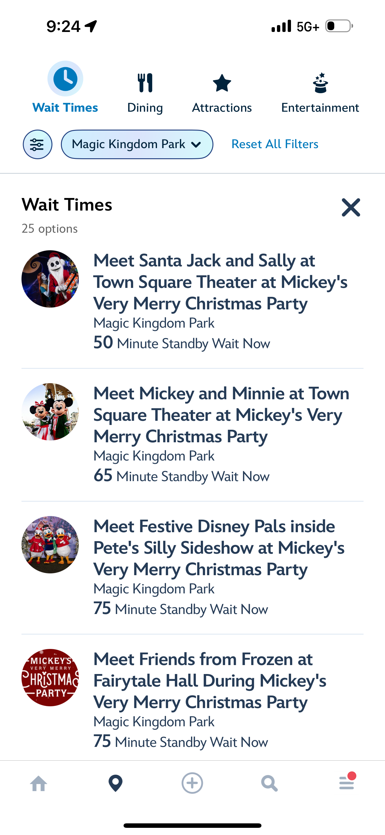 The Disney World app lists wait times for some of the major greetings, as shown below.