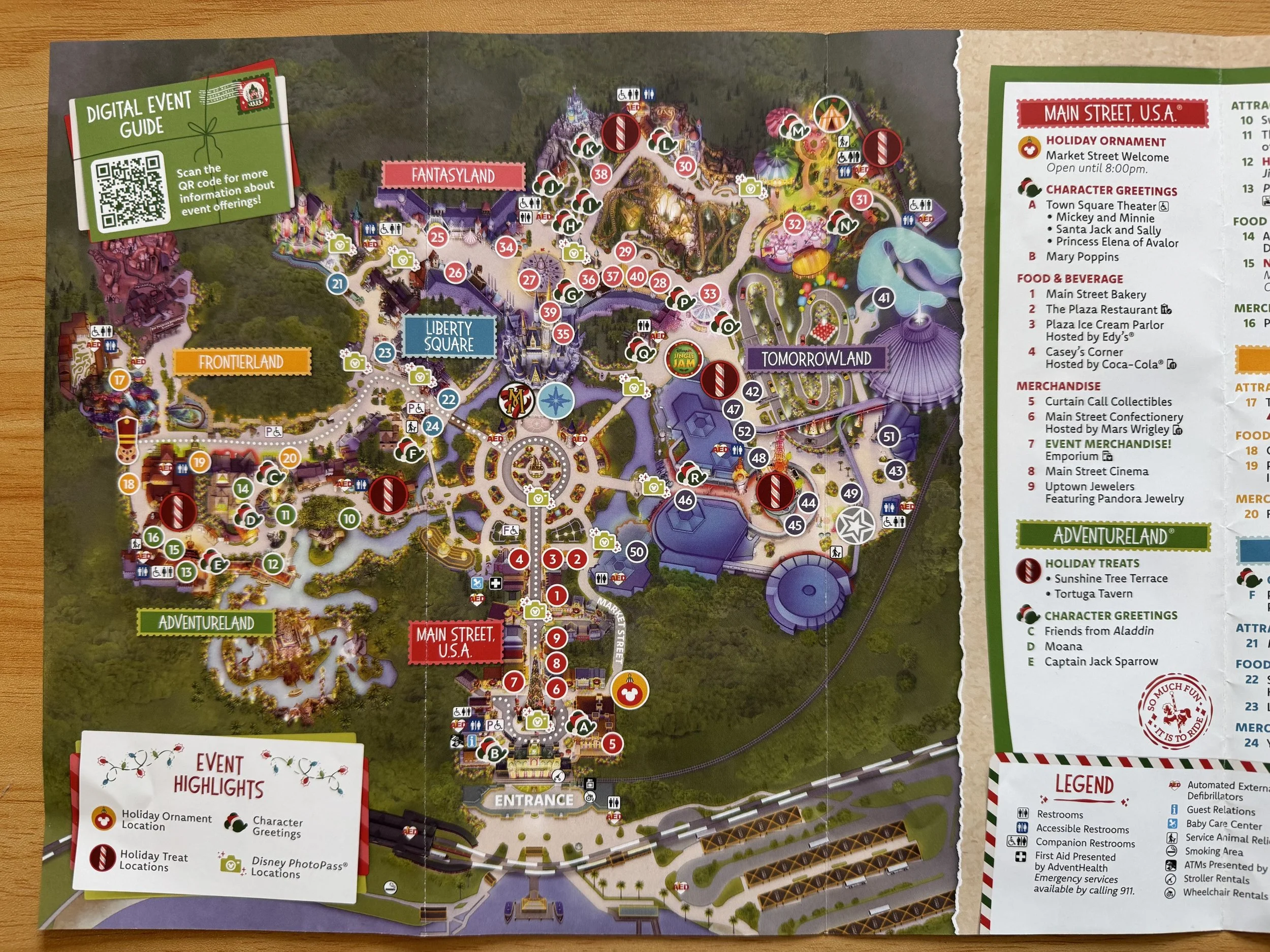 In 2025, Mickey’s Very Merry Christmas Party offers six treat stops across the park. The stops don't all have every treat. Instead, you’ll basically find a cookie and maybe a beverage (e.g. hot cocoa, eggnog) at each site. The sites are all marked with a candy-cane marker.